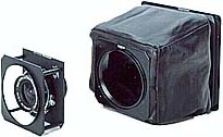 広角沈みボード 品番4544 (実用新案) 65、75ミリ広角レンズ撮影時、無理なあおりにも自在作動。しかもシャッター操作がすべて真横からできる便利さ。 袋蛇腹(実用新案) 品番4541 65〜90ミリレンズあおり撮影用。単独使用の他、65・75ミリ広角レンズ用沈みボードと併用すれば操作性抜群 |