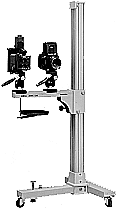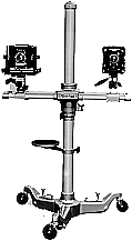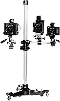 Able stand L-360 No.460 (Utility Model) OH - 165cm Effective H -164cm Min. H to panhead - 62cm Arm L - 41cm 2 cameras revolve 360Kon the arm. Coincident Lens position allows quick shots. No twist of Synchro cords. |